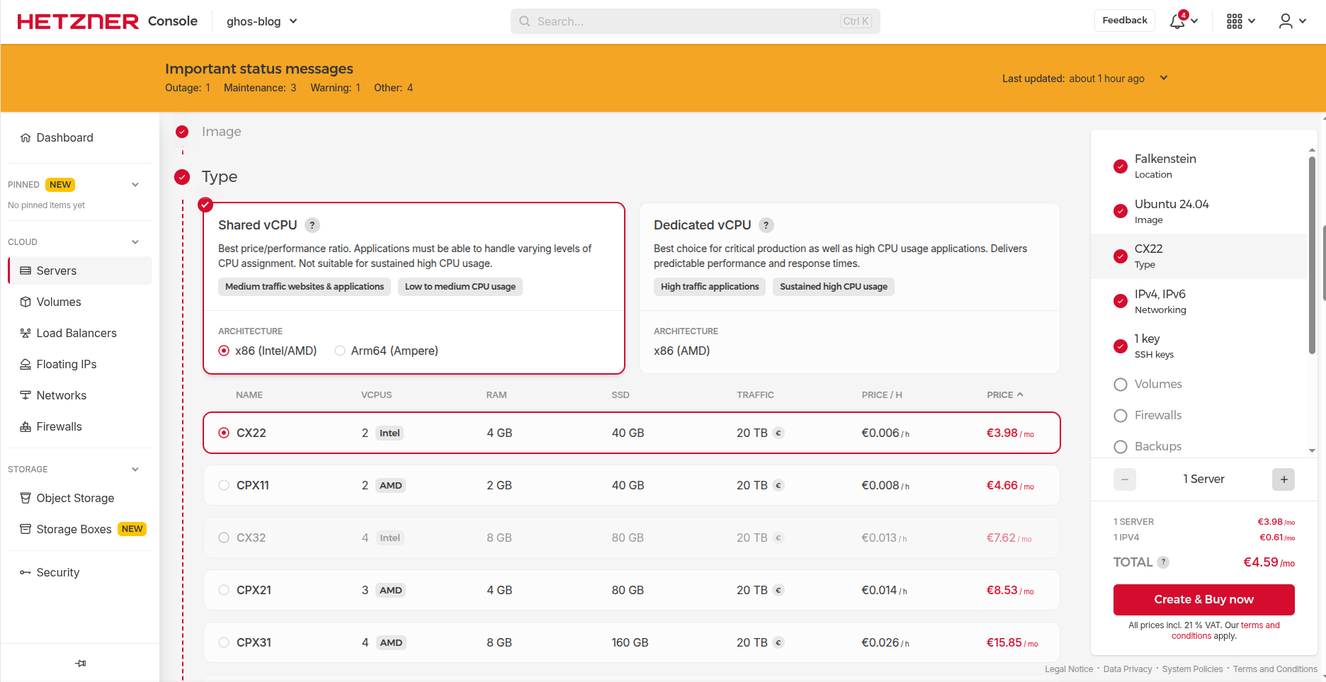 Hetzner nabízí servery od 4 až 5 € například CX22, který má dvě Intel jádra, 4 GB RAM a 40 GB SSD, což pro Ghost musí bohatě stačit. Bohužel v době, když sem si vyhradil čas, tak nebyl dostupný a musel jsem zvolit CPX21, který je dvakrát dražší a pravděpodobně ho časem zmigruji na CX22.