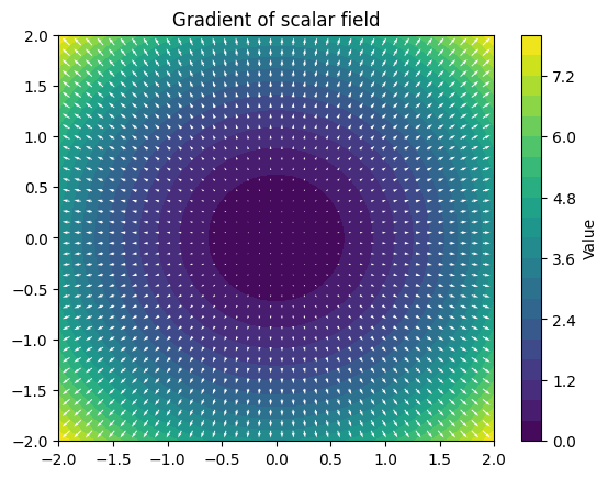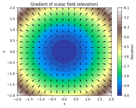 Gradient tedy převádí skalární pole (například pole nadmořské výšky) na vektorové pole, které v každém bodě ukazuje směr největší změny. Právě proto se gradient objevuje v mnoha fyzikálních zákonech – například při popisu proudění tepla, difuze látek nebo elektrického pole.